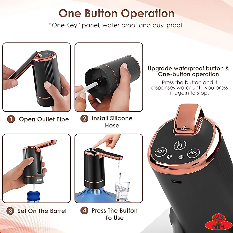The Akari Neer-4 Wireless Automatic Water Dispenser is a compact, rechargeable device designed for effortless water dispensing. Equipped with a USB Type-C charging port and a 1200mAh battery, it can pump up to 100 liters of water on a single charge. Its one-touch operation and blue LED illumination make it user-friendly, even in low-light conditions. The dispenser is compatible with standard 70mm diameter water bottle necks, ensuring versatility across various bottle types. Its sleek design and quick setup process make it suitable for home, office, or travel use.