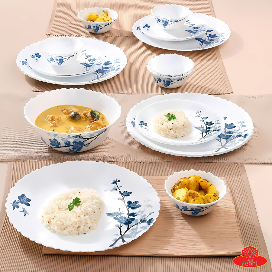 Add a touch of elegance to your dining table with the Borosil Larah Fluted Dinner Set in the charming Mimosa pattern. Crafted from toughened opal glass, this set is chip-resistant, non-porous, and hygienic—perfect for everyday use or special occasions. The lightweight design ensures ease of handling, while the vibrant yellow floral prints enhance the aesthetic appeal of your meals. Microwave-safe and dishwasher-safe, this 19-piece set blends functionality with beauty.