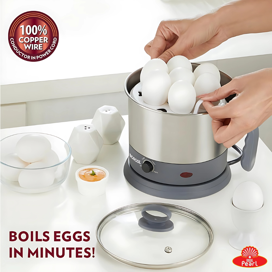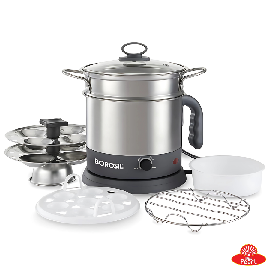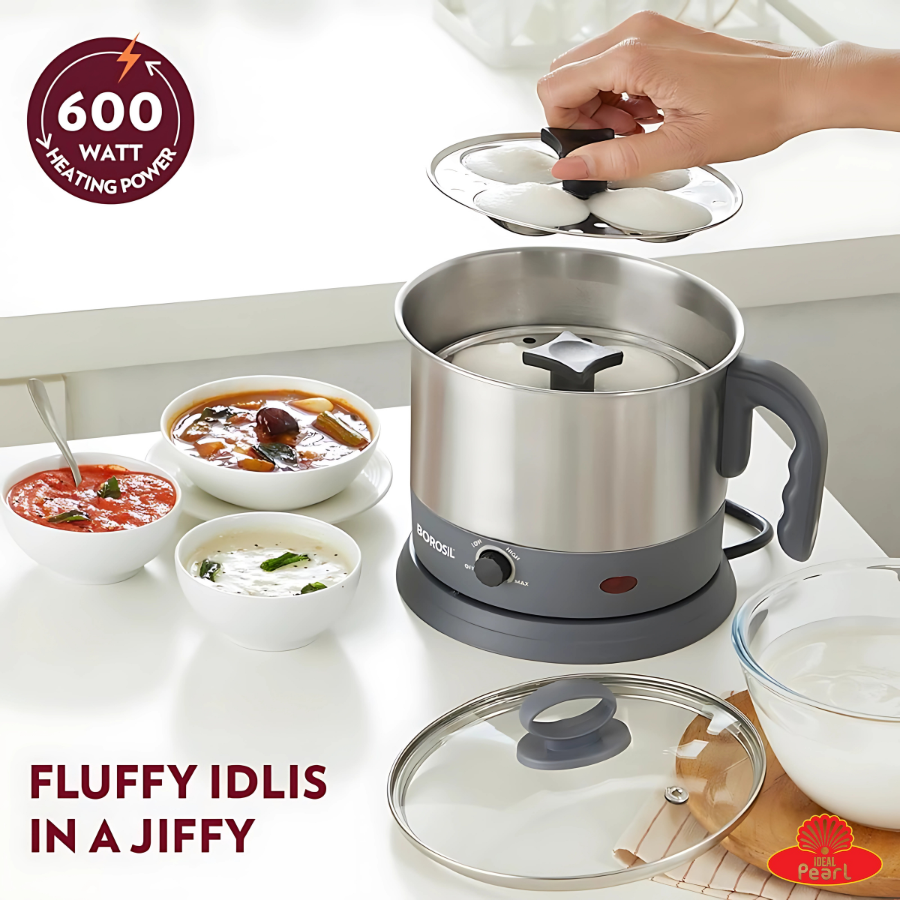 The Borosil Quick 1.3L Multi Kettle is your all-in-one cooking solution for quick meals and multitasking in the kitchen. With a powerful 600-watt heating element, it allows you to boil water, brew tea or coffee, steam vegetables, cook noodles, poach eggs, make idlis, or grill snacks — all in one compact and easy-to-use device.
