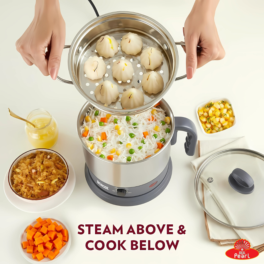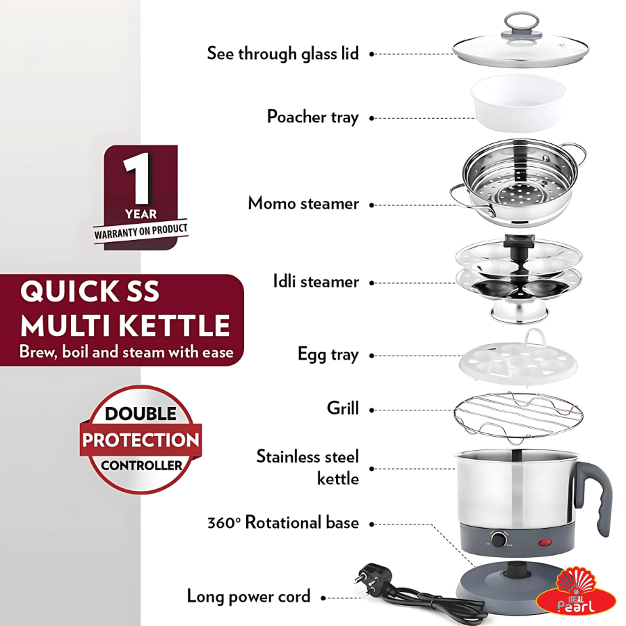 Its durable stainless steel body gives it a sleek, modern look and ensures long-lasting performance. Whether you're a student in a hostel, a working professional, or someone who loves quick recipes, this multi kettle simplifies your cooking tasks without the need for multiple appliances.