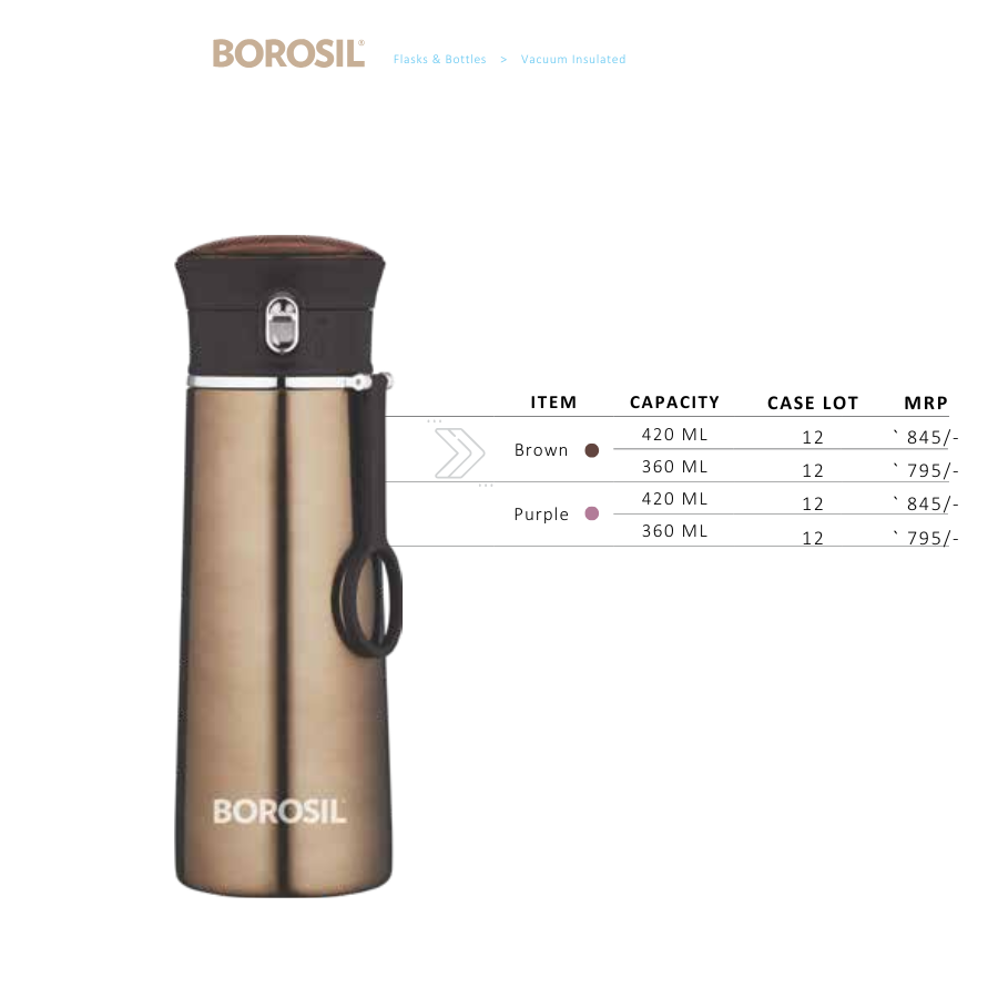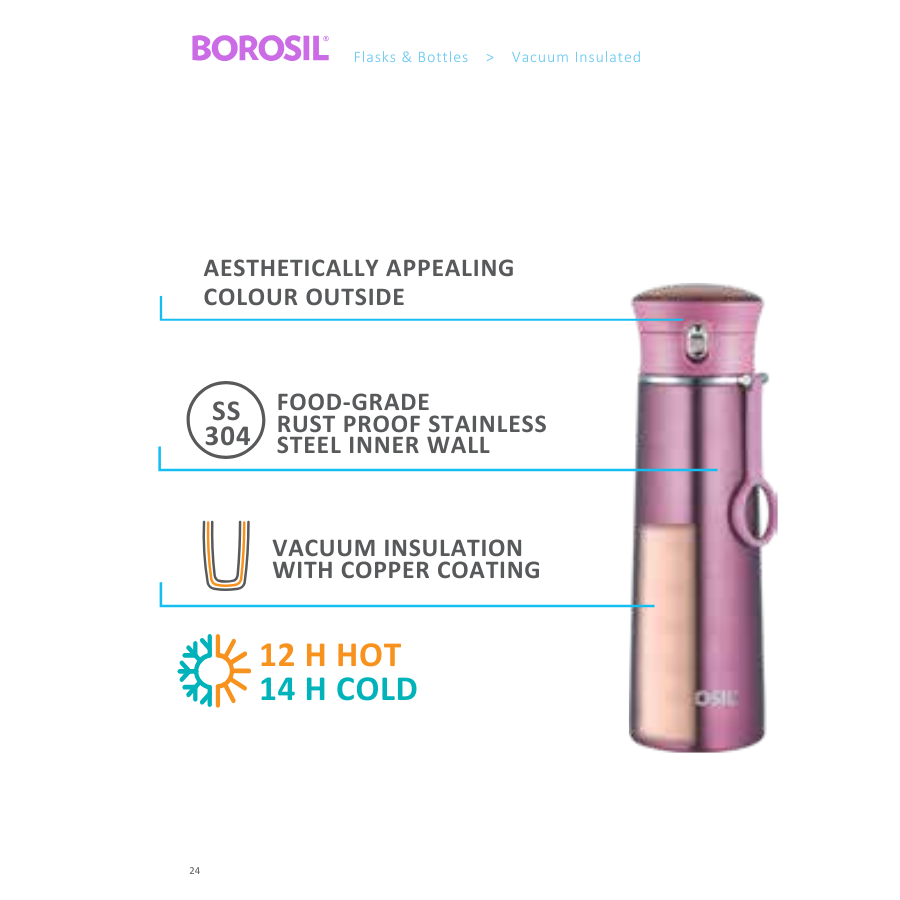 The Borosil Travelease Flask is a sleek, vacuum-insulated stainless steel bottle designed to keep your beverages hot or cold for extended periods. Its compact and stylish design makes it ideal for daily use, whether you're at the office, gym, school, or on the go.