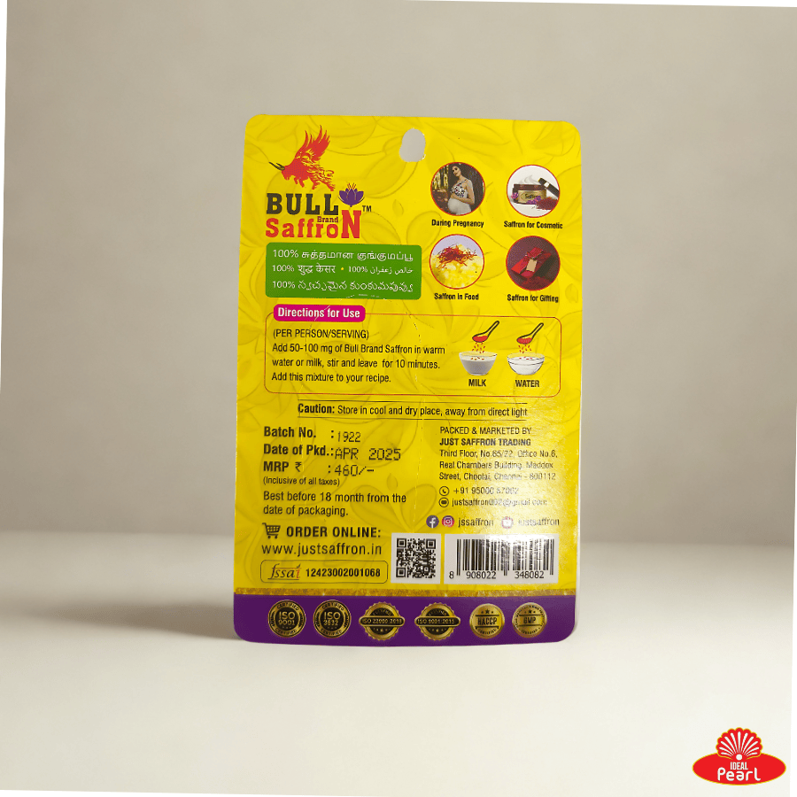 BULL BRAND SAFFRON 1GM – Premium quality saffron strands known for their rich aroma, vibrant color, and strong flavor. Perfect for enhancing the taste and presentation of desserts, beverages, and traditional dishes. Sourced carefully to ensure purity and freshness in every gram.