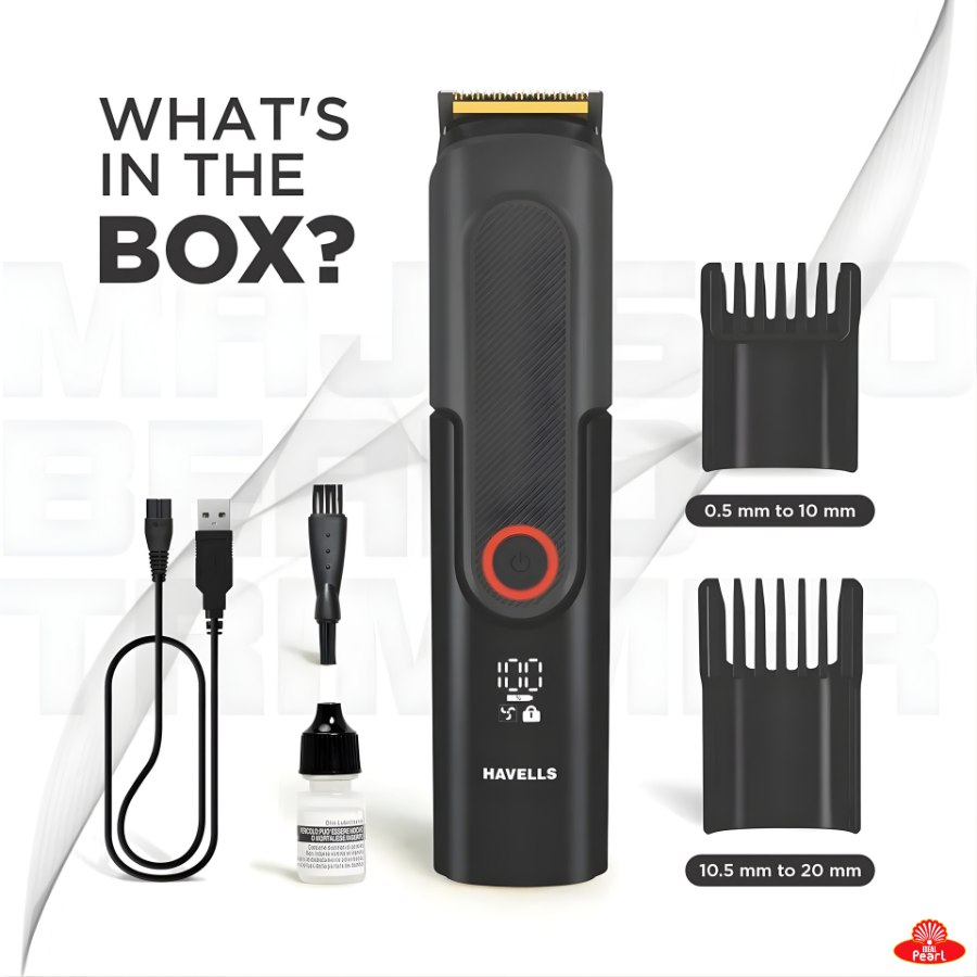 The Havells Majesto Beard Trimmer BT8888 is a versatile grooming tool designed to make daily beard and moustache maintenance simple, precise, and comfortable. It features sharp, titanium-coated blades that deliver smooth trimming with minimal pulling and reduce the risk of nicks or irritation on sensitive skin. With up to 40 adjustable length settings, it lets you customise styles from close stubble to longer beard lengths with fine control. The trimmer is IPX7 waterproof, meaning it can be rinsed clean under running water and used in wet conditions, and it includes a digital display for easy monitoring of battery and settings. Its dual-speed mode lets you switch between precision trimming and faster cutting, while a long-lasting rechargeable battery provides extended cordless use — often up to around 120 minutes on a full charge — for multiple grooming sessions without frequent recharging. This combination of features makes it a reliable choice for everyday grooming and styling needs.