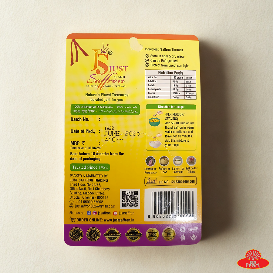 JUST SAFFRON 1GM – Premium quality, aromatic saffron threads carefully selected for their rich color, flavor, and fragrance. Ideal for enhancing the taste and aroma of your dishes, desserts, and beverages. Pure, natural, and perfect for culinary or festive use.