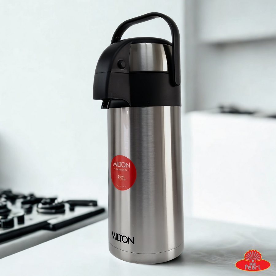 The Milton Airpot Beverage Dispenser (3500ml) is the ideal solution for serving beverages with ease and efficiency. Crafted from high-grade stainless steel, it features double-wall vacuum insulation with inner copper coating, ensuring your drinks stay hot or cold for extended hours. Its airpot press-button mechanism enables smooth, one-handed dispensing without lifting or tilting, making it perfect for busy settings like offices, conferences, or outdoor events. With a generous 3.5L capacity, leak-proof lid, and strong carrying handle, it offers maximum convenience, hygiene, and portability.