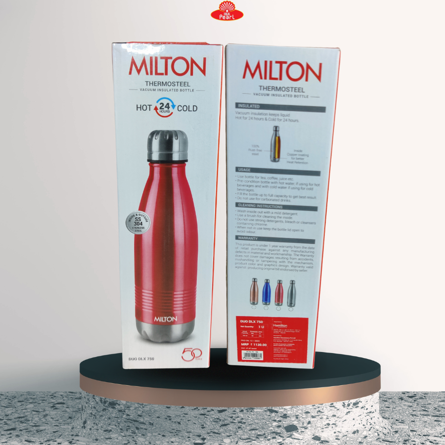 The Milton Thermosteel Duo DLX 750 ml Bottle is a premium vacuum-insulated flask crafted from high-quality 304-grade stainless steel. Its double-walled design, enhanced with an inner copper coating, ensures that beverages remain hot or cold for up to 24 hours. The bottle features a unique flip lid that doubles as a cup, facilitating hassle-free and spill-free pouring. Its leak-proof, rust-resistant, and unbreakable construction makes it ideal for home, office, travel, or outdoor use. Available in various colors, including maroon, blue, and rose gold, it combines functionality with style.