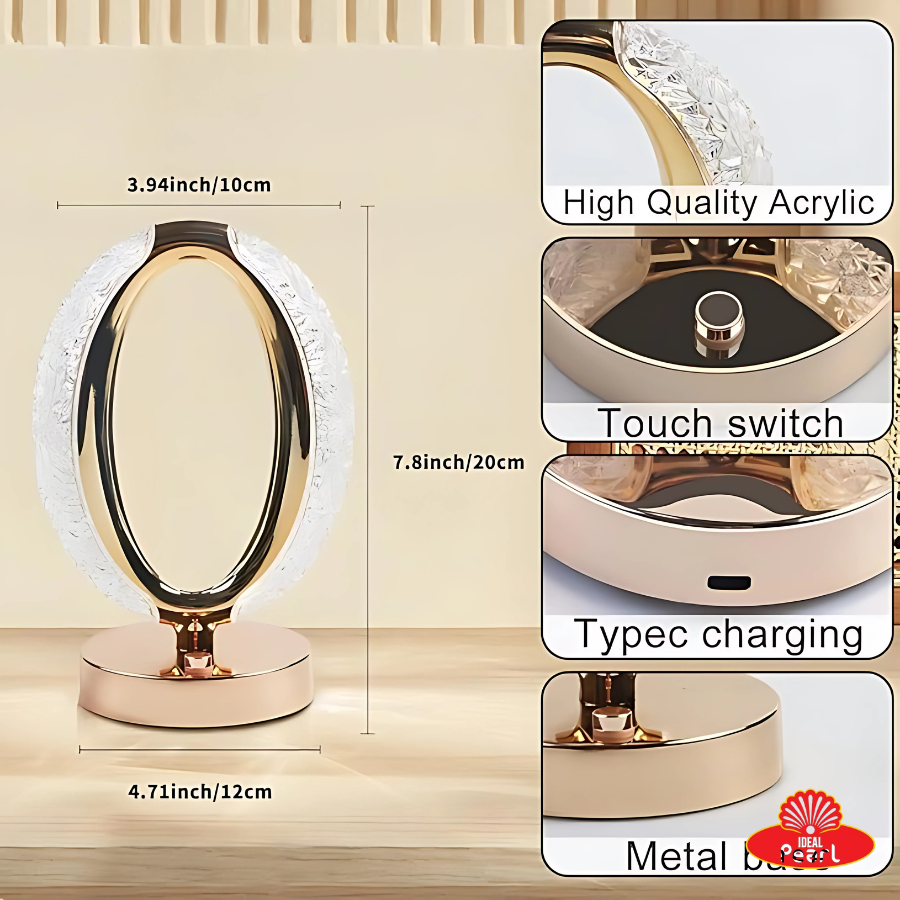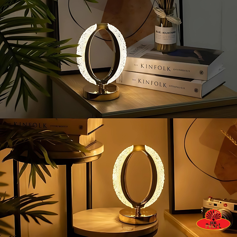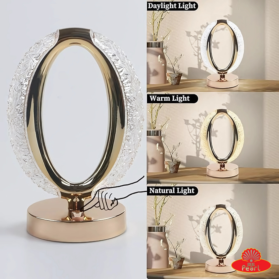 Elegant and futuristic ring-shaped LED table lamp with crystal detailing and a sleek metallic finish. Features touch control for easy operation and offers 3 light modes – Daylight, Warm Light, and Natural Light – to suit any mood or setting. Ideal for bedrooms, desks, or living spaces, combining decorative charm with functional lighting.