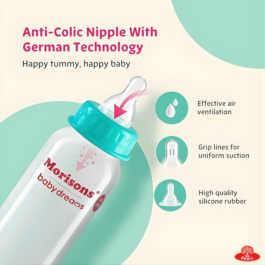 Morison Baby Feeding Bottle Regular 125ml – A safe and reliable feeding solution for infants, designed with high-quality, BPA-free materials. Its ergonomic shape ensures easy handling for parents, while the anti-colic nipple helps reduce discomfort during feeding. Perfect for everyday use, keeping your baby comfortable and well-fed.