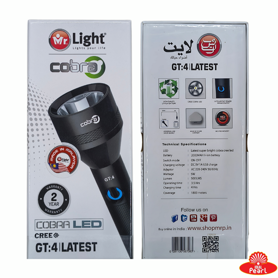 The MR. Light Cobra LED Flashlight GT4 is a high-performance, rechargeable flashlight designed for durability and powerful illumination. Featuring a sleek aluminum body, it delivers intense brightness with multiple lighting modes, making it ideal for outdoor, tactical, and emergency use. Its compact, ergonomic design ensures a secure grip and easy handling.