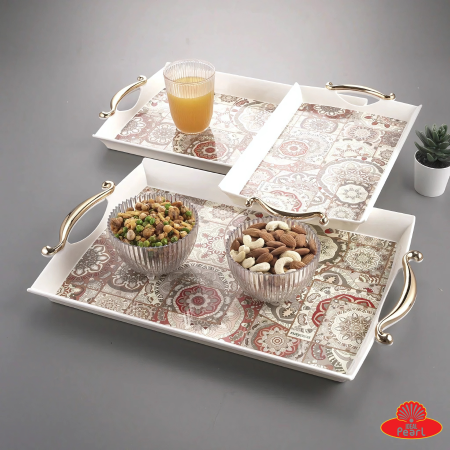 Serve in style with the Nayasa Regency Serving Tray Set, which includes three versatile trays in small, medium, and large sizes. Crafted from durable, high-quality plastic with an elegant Regency design, these trays are ideal for everyday use and special occasions. The trays feature raised edges and sturdy handles for easy handling, making them perfect for serving tea, snacks, or meals.