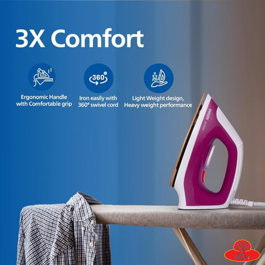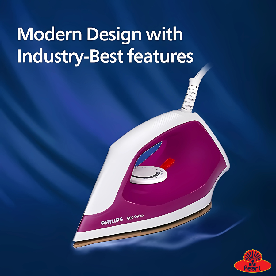 Experience effortless ironing with the Philips DuraEase Dry Iron DST6001/30, built for smooth performance and lasting durability. Powered by a 1000W heating element, it heats up quickly and delivers uniform heat for crisp, wrinkle-free clothes. The non-stick soleplate ensures smooth gliding over all fabrics, while the lightweight and ergonomic design makes ironing comfortable and convenient.