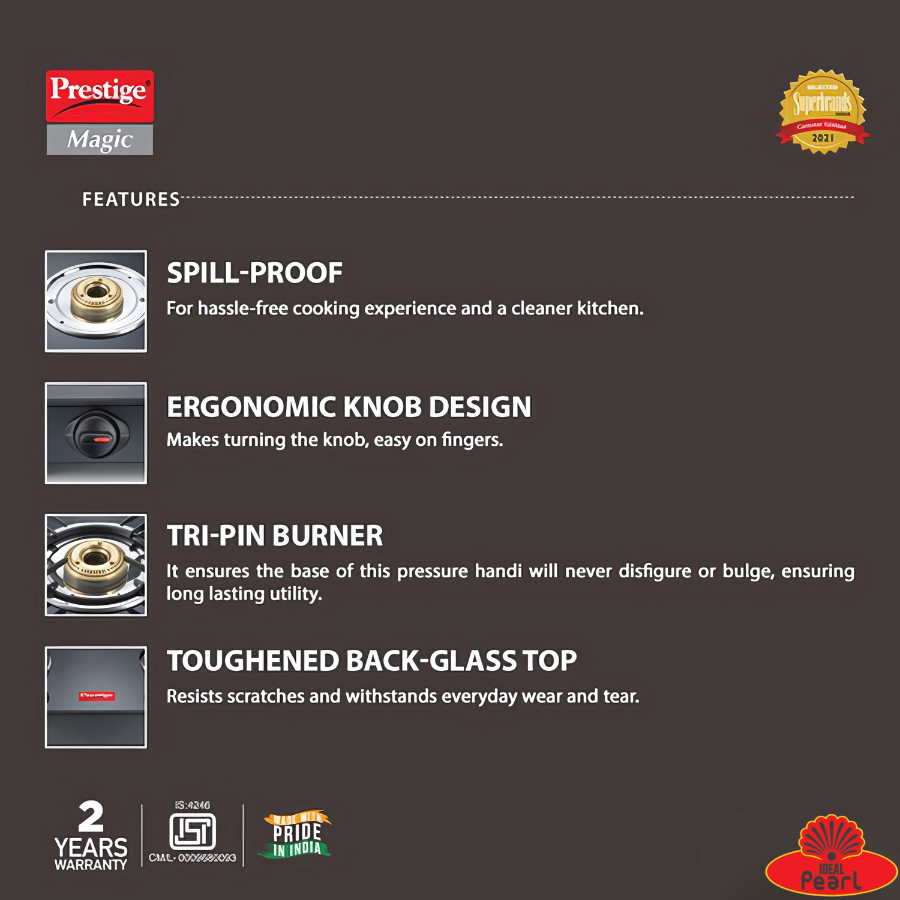 Prestige Magic Glass Top Gas Stove (2 Burners) - GTMC 02 is a compact and stylish gas stove designed to enhance modern kitchens. Its sleek black and silver finish, combined with practical features, makes it a suitable choice for small to medium-sized households.