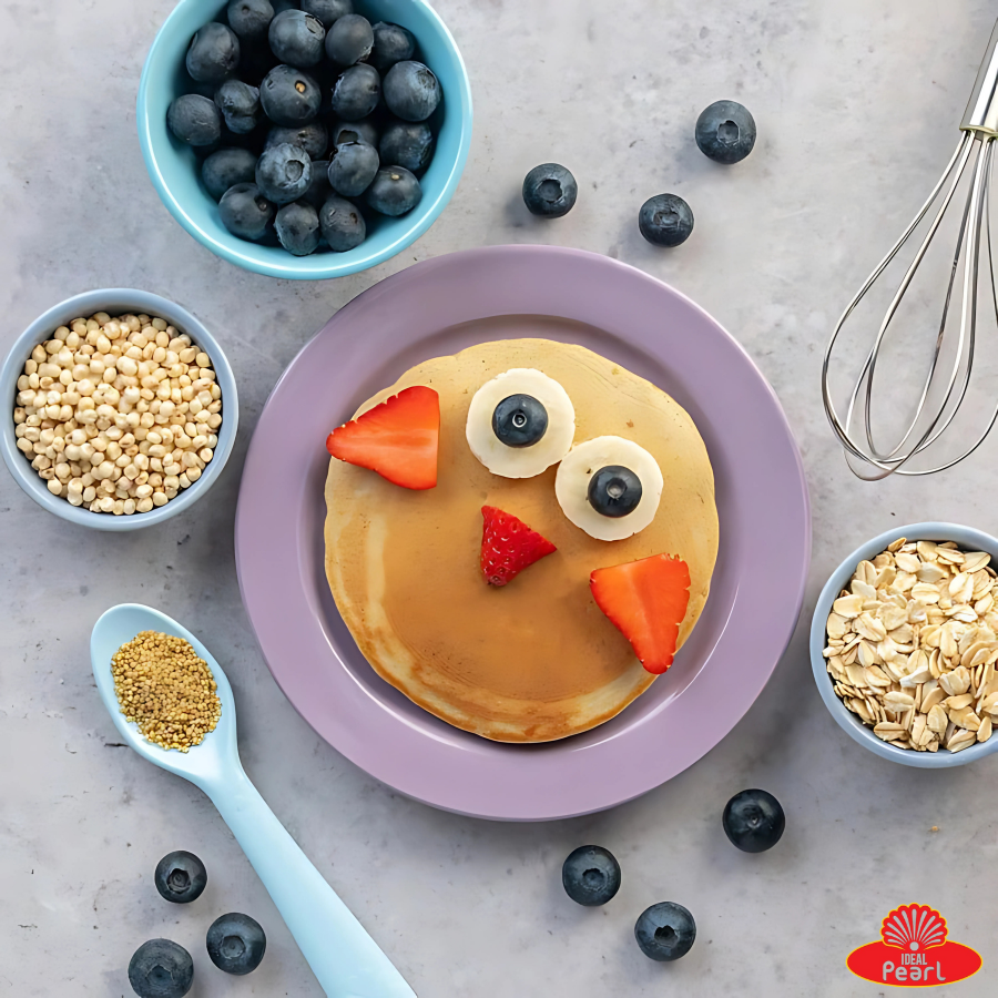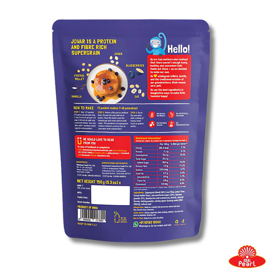 A tasty and nutritious pancake mix made from a blend of jowar, foxtail millet, oats, banana powder, and real dried blueberries and cranberries. This mix is free from maida, refined sugar, preservatives, artificial colors, and flavors—making it a healthy choice for kids and adults alike.