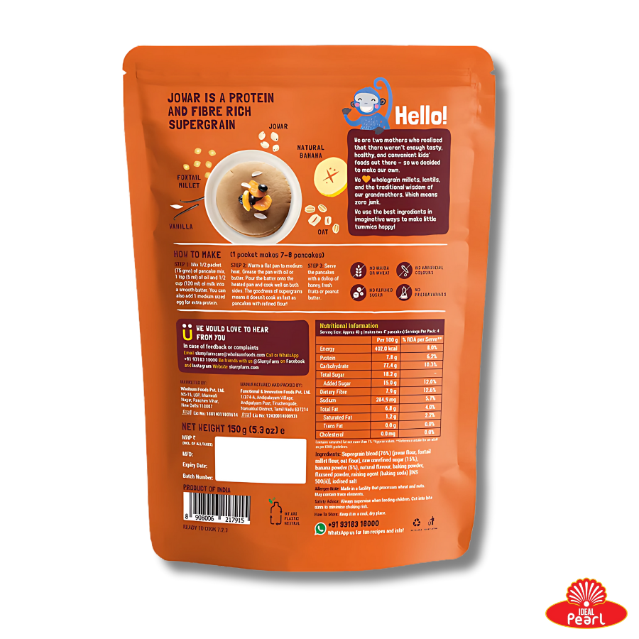 Made with a nourishing blend of ancient millets like jowar and foxtail millet, oats, banana powder, jaggery, vanilla, and flaxseeds, this classic pancake mix is a wholesome and delicious option for children and adults alike. The mix is completely free from maida, refined sugar, preservatives, artificial colours, and flavours—making it a clean, safe choice for regular consumption.