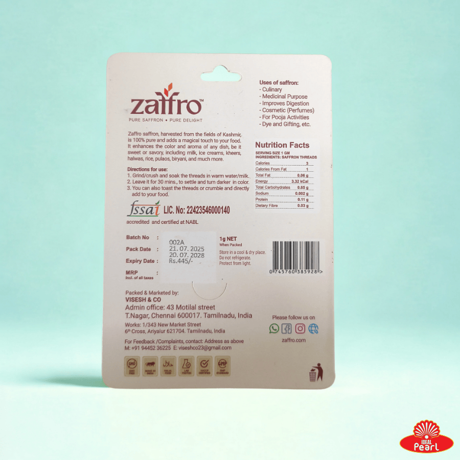 Zaffro Saffron 1gm is a premium grade saffron known for its rich aroma, deep red threads, and authentic flavor. Handpicked and naturally dried, it enhances the taste, color, and fragrance of a variety of dishes. Ideal for desserts, biryanis, milk, and traditional recipes, it also carries health and wellness benefits.