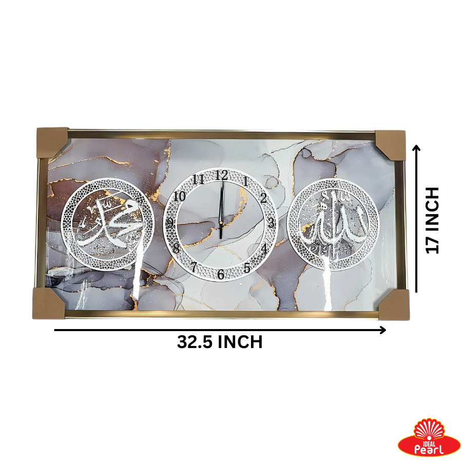 This elegant Islamic wall clock is a beautiful combination of faith and functionality. The design features a central clock flanked by two intricate calligraphy motifs—on the left is the name "Muhammad" (ﷺ), and on the right is the name "Allah" (ﷻ), both adorned in a fine, lace-like circular frame.