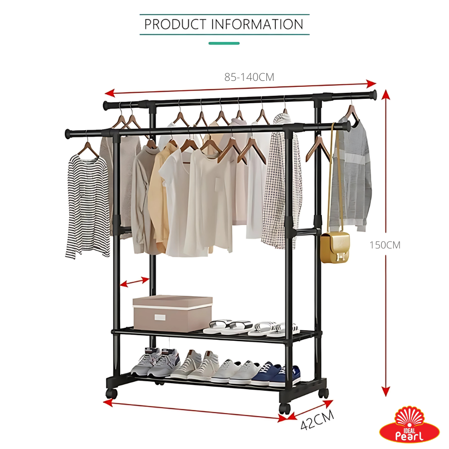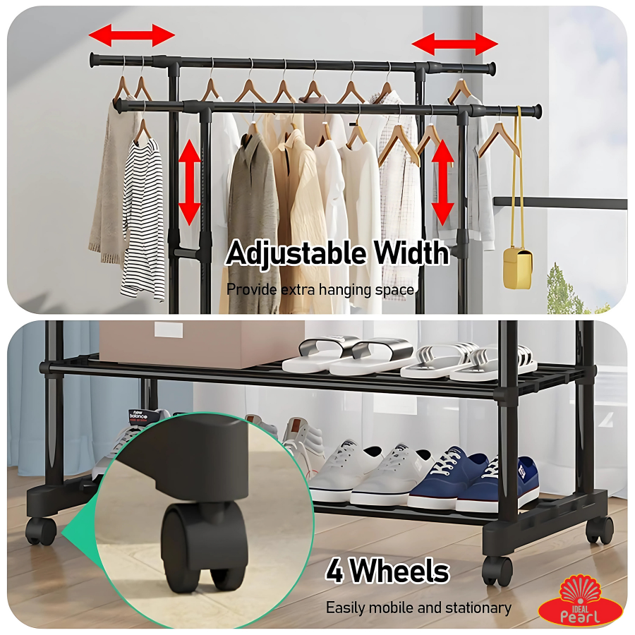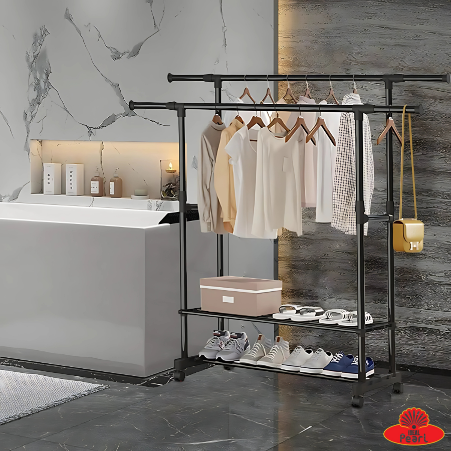 This Multipurpose Adjustable Clothes & Shoe Storage Rack is the perfect solution for organizing your daily essentials. Made with a durable steel frame and high-quality plastic connectors, it provides stability and long-lasting use. The double hanging rods allow you to hang shirts, dresses, coats, and trousers neatly, while the side hooks are ideal for bags, hats, or scarves. The bottom tier shelves offer ample space for storing shoes, boxes, or folded clothes, keeping everything tidy and within reach.