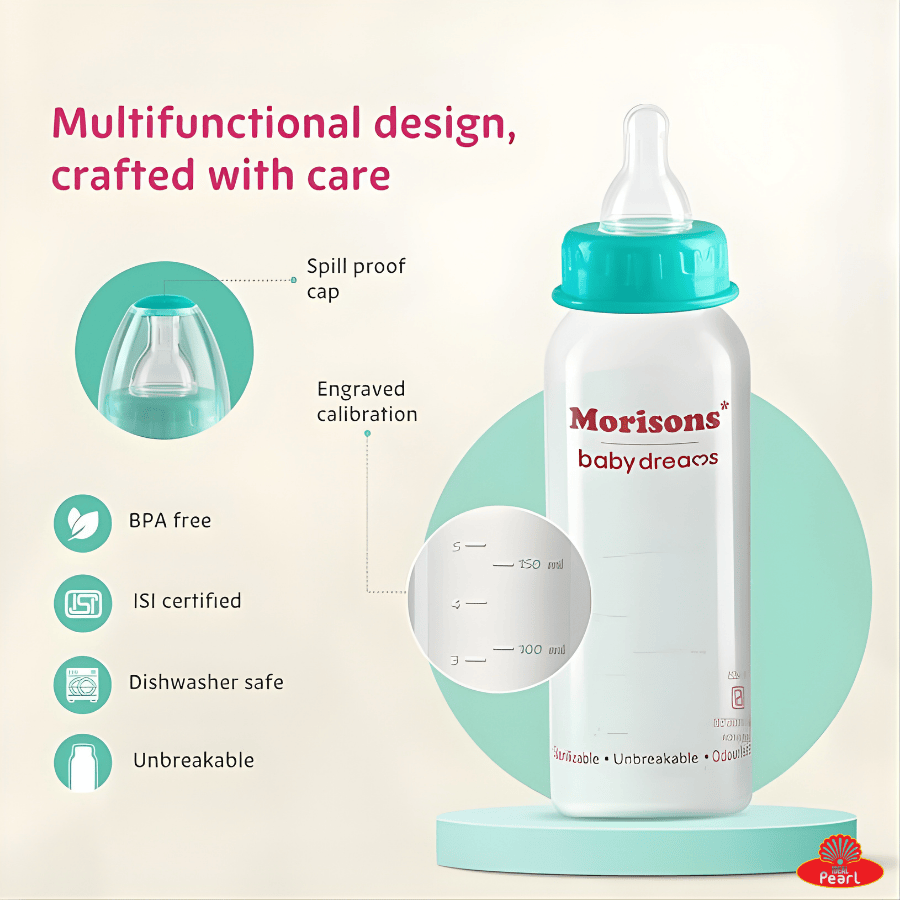 The Morison Feeding Bottle Regular 250ml is designed for infants aged 6 to 12 months. Made from safe, durable materials, it ensures easy feeding and hygienic storage of milk or formula. Its ergonomic design allows a comfortable grip for both parents and babies, while the leak-proof nipple supports smooth and controlled feeding. Ideal for everyday use, it combines practicality with infant-friendly safety.