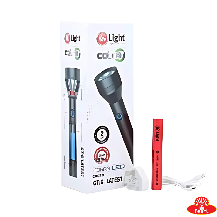 Mr. Light Cobra LED Flash Light GT6 is a high-performance rechargeable flashlight designed for outdoor enthusiasts, security personnel, and anyone requiring powerful illumination over long distances.